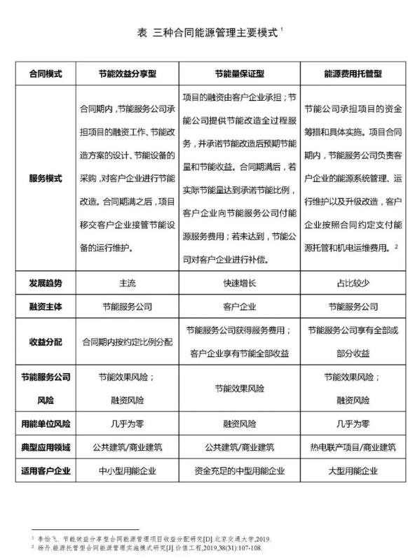 其中,能源績(jī)效合同管理是當(dāng)前國內(nèi)的主流能源管理模式,共分為節(jié)能效益分享型、節(jié)能量保證型和能源費(fèi)用托管型合同管理模式。