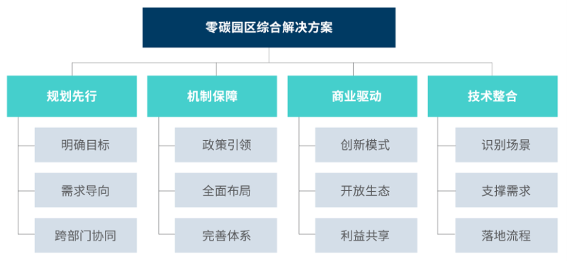 報(bào)告提出,在零碳目標(biāo)的指引下,應(yīng)以系統(tǒng)化的綜合解決方案為抓手,以技術(shù)可行、經(jīng)濟(jì)合理、互利共贏的模式實(shí)現(xiàn)園區(qū)零碳轉(zhuǎn)型,助力園區(qū)實(shí)現(xiàn)經(jīng)濟(jì)發(fā)展與碳排放脫鉤。其中,零碳園區(qū)綜合解決方案包括能源規(guī)劃、政策機(jī)制、商業(yè)模式和技術(shù)應(yīng)用在內(nèi)的四個(gè)維度: