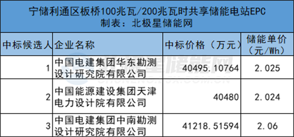 中國儲能網(wǎng)訊:3月12日,寧夏儲能技術(shù)服務(wù)有限公司發(fā)布寧儲利通區(qū)板橋100 兆瓦/200 兆瓦時共享儲能電站 EPC中標候選人公示。中國電建集團華東勘測設(shè)計研究院有限公司為第一候選人,中標價格40495.10764萬元,中標單價2.025元/Wh。中國能源建設(shè)集團天津電力設(shè)計院有限公司為第二候選人,中標價格40480萬元,中標單價2.024元/Wh。第三候選人為中國電建集團中南勘測設(shè)計研究院有限公司,中標價格41218.515935萬元,中標單價2.06元/Wh。