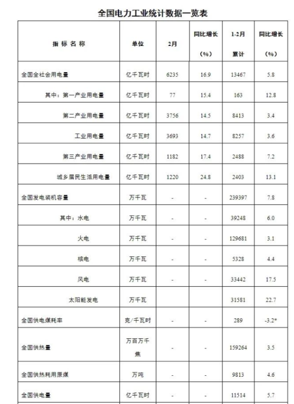 3月21日,國家能源局發(fā)布1-2月份全國電力工業(yè)統(tǒng)計數(shù)據(jù)。截至2月底,全國發(fā)電裝機(jī)容量約23.9億千瓦,同比增長7.8%。其中,風(fēng)電裝機(jī)容量約3.3億千瓦,同比增長17.5%;太陽能發(fā)電裝機(jī)容量約3.2億千瓦,同比增長22.7%。