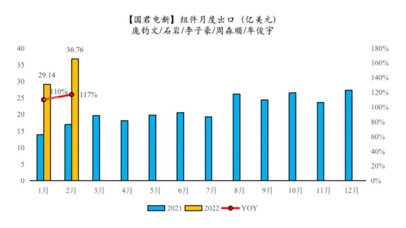 與此同時,1~2月份光伏組件的出口量也出現(xiàn)大幅上升。根據(jù)國君電新的統(tǒng)計數(shù)據(jù),1~2月的組件出口額同比增長110%以上!