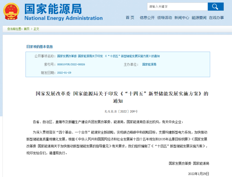 國家發(fā)展改革委 國家能源局關(guān)于印發(fā)《“十四五”新型儲(chǔ)能發(fā)展實(shí)施方案》的通知