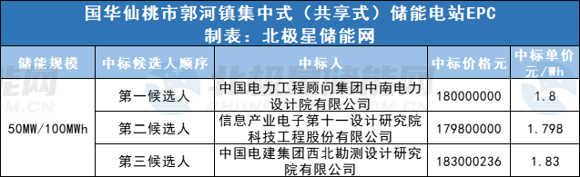 中國電力工程顧問集團中南電力設計院有限公司為第一中標候選人,中標價格1.8億元,儲能單價1.8元/Wh。信息產(chǎn)業(yè)電子第十一設計研究院科技工程股份有限公司為第二中標候選人,中標價格1.798億,儲能單價1.798元/Wh。中國電建集團西北勘測設計研究院有限公司為第三中標候選人,中標價格1.83000236億,中標單價1.83元/Wh。