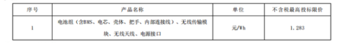 本次招標(biāo)的預(yù)估規(guī)模為80萬(wàn)組,折合為1036.8MWh。本項(xiàng)目設(shè)置最高投標(biāo)限價(jià),電池組(含BMS、電芯、殼體、把手、內(nèi)部連接線)、無(wú)線傳輸模塊、無(wú)線天線、電源接口的不含稅最高投標(biāo)限價(jià)為1.283元/Wh。投標(biāo)人投標(biāo)報(bào)價(jià)高于最高投標(biāo)限價(jià)的,其投標(biāo)將被否決。