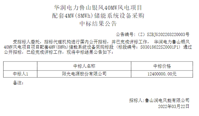 中國儲能網(wǎng)訊:3月22日,華潤電力發(fā)布河南平頂山魯山銀風(fēng)40MW風(fēng)電項目配套4MW/8MWh儲能系統(tǒng)設(shè)備采購中標(biāo)公示。陽光電源(300274)以單價1.55元/Wh中標(biāo)。