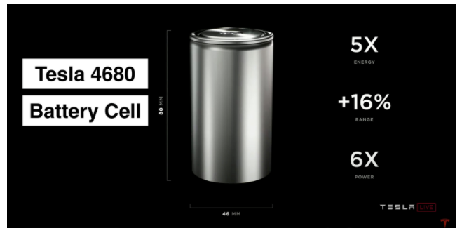 2020年9月,特斯拉發(fā)布4680新型圓柱電池。該電池由950個(gè)電芯組成,能量密度約300kWh/kg。與特斯拉此前使用的松下2170電池相比,4680電池的尺寸更大,容量提升了5倍,輸出功率提升了6倍。預(yù)計(jì)可使整車?yán)m(xù)駛里程增加16%,成本下降14%。