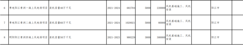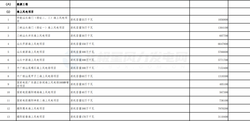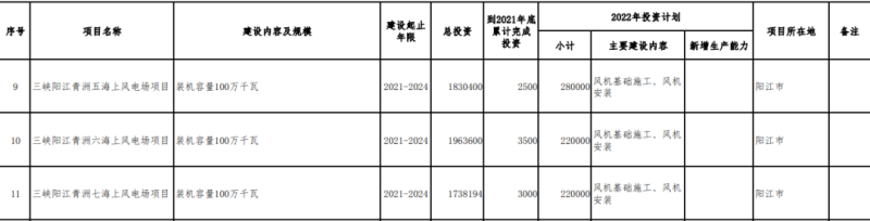 項(xiàng)目包括:海上風(fēng)電投產(chǎn)項(xiàng)目1個(gè),50萬千瓦;續(xù)建項(xiàng)目11個(gè),共計(jì)750萬千瓦;新開工項(xiàng)目2個(gè),共計(jì)95萬千瓦。