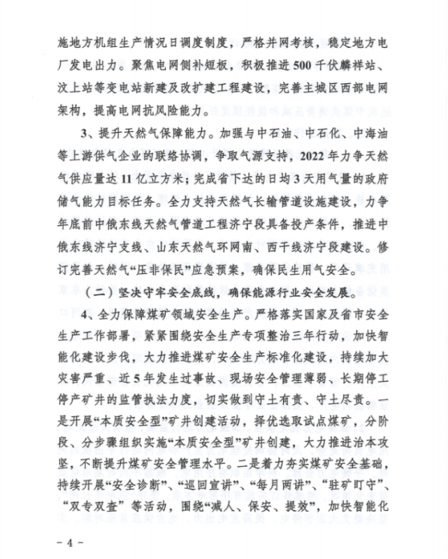 2、能源生產(chǎn)方面:(1)按照現(xiàn)行政策不變的情況下,2022年內(nèi)全市煤炭產(chǎn)量穩(wěn)定在5200萬(wàn)噸左右;各類發(fā)電企業(yè)完成發(fā)電量490億千瓦時(shí)左右;(2)貫徹落實(shí)國(guó)家及省市煤電裝機(jī)相關(guān)政策,穩(wěn)步實(shí)施“上大壓小”,2022年煤電裝機(jī)容量穩(wěn)定在1050萬(wàn)千瓦左右;(3)立足濟(jì)寧市資源稟賦實(shí)際,加快新能源開發(fā)利用和消納能力提升,力爭(zhēng)2022年底新能源總裝機(jī)實(shí)現(xiàn)350萬(wàn)千瓦,新能源發(fā)電量完成45億千瓦時(shí)。