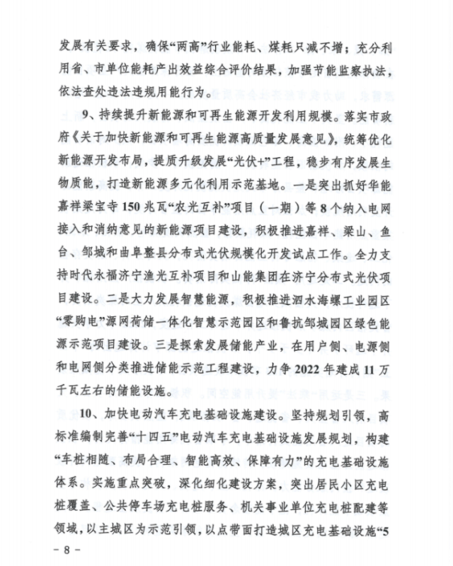 持續(xù)提升新能源和可再生能源開發(fā)利用規(guī)模。落實(shí)市政府《關(guān)于加快新能源和可再生能源高質(zhì)量發(fā)展意見》,統(tǒng)籌優(yōu)化新能源開發(fā)布局,提質(zhì)升級(jí)發(fā)展“光伏+”工程,穩(wěn)步有序發(fā)展生物質(zhì)能,打造新能源多元化利用示范基地。一是突出抓好華能嘉祥梁寶寺150兆瓦“農(nóng)光互補(bǔ)”項(xiàng)目(一期)等8個(gè)納入電網(wǎng)接入和消納意見的新能源項(xiàng)目建設(shè),積極推進(jìn)嘉祥、梁山、魚臺(tái)、鄒城和曲阜整縣分布式光伏規(guī)?;_發(fā)試點(diǎn)工作。全力支持時(shí)代永福濟(jì)寧漁光互補(bǔ)項(xiàng)目和山能集團(tuán)在濟(jì)寧分布式光伏項(xiàng)目建設(shè)。二是大力發(fā)展智慧能源,積極推進(jìn)泗水海螺工業(yè)園區(qū)“零購(gòu)電”源網(wǎng)荷儲(chǔ)一體化智慧示范園區(qū)和魯抗鄒城園區(qū)綠色能源示范項(xiàng)目建設(shè)。三是探索發(fā)展儲(chǔ)能產(chǎn)業(yè),在用戶側(cè)、電源側(cè)和電網(wǎng)側(cè)分類推進(jìn)儲(chǔ)能示范工程建設(shè),力爭(zhēng)2022年建成11萬(wàn)千瓦左右的儲(chǔ)能設(shè)施。