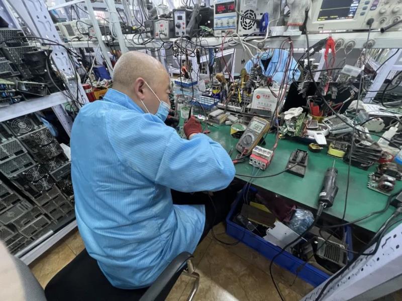 電源開關(guān)回收線上,維修工程師彭海波正在修理電源模塊的控制板?!皯?yīng)該是控制電流的元器件短路了,修理好估計需要一天時間?!?