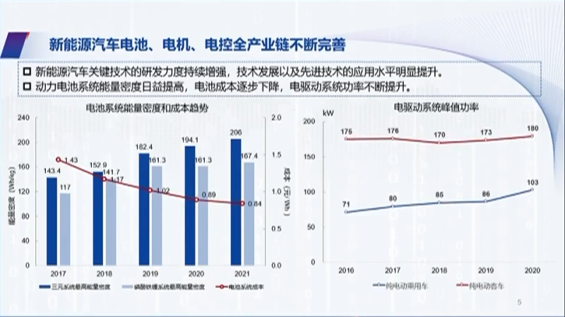 以動(dòng)力電池系統(tǒng)為例,據(jù)全國(guó)政協(xié)經(jīng)濟(jì)委員會(huì)副主任 苗圩展示數(shù)據(jù)來(lái)看,在2017-2021年五年中,三元電池系統(tǒng)的能量密度從143Wh/kg提升至206Wh/kg,磷酸鐵鋰電池的能量密度從117Wh/kg提高到167.4Wh/kg。電池成本也同樣在逐步下降,已從2017年的1.43元/ Wh降至2021年的0.84元/ Wh。