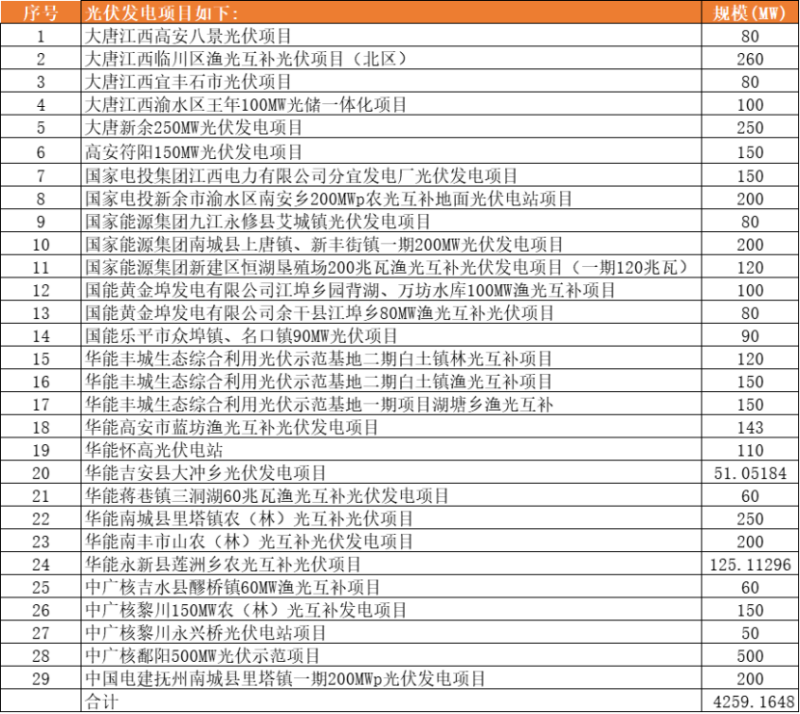 中國(guó)儲(chǔ)能網(wǎng)訊:近期,江西省發(fā)展改革委下達(dá)了2022年第一批省重點(diǎn)建設(shè)項(xiàng)目計(jì)劃的通知。據(jù)悉,2022年第一批省重點(diǎn)建設(shè)項(xiàng)目安排491項(xiàng),總投資17071億元,年度計(jì)劃投資4165億元。其中,建成投產(chǎn)項(xiàng)目62項(xiàng),續(xù)建項(xiàng)目228項(xiàng),計(jì)劃新開(kāi)工項(xiàng)目189項(xiàng),預(yù)備項(xiàng)目12項(xiàng)。而重點(diǎn)建設(shè)光伏項(xiàng)目共29個(gè),規(guī)模4259.1648MW。具體項(xiàng)目如下: