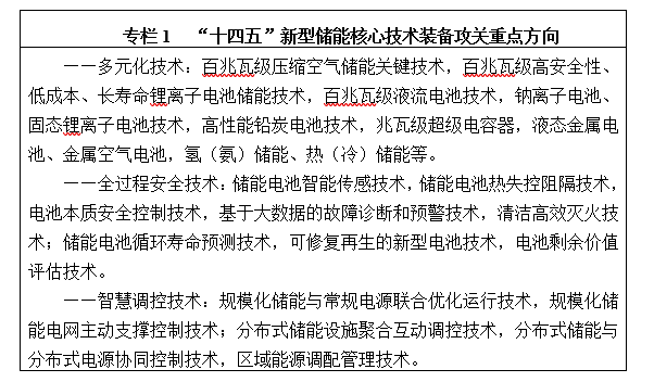 新型儲(chǔ)能關(guān)鍵技術(shù)研發(fā)是先決條件,在《實(shí)施方案》中,技術(shù)創(chuàng)新被提到前所未有的高度,在六大重大任務(wù)方向中排在首位,這六大任務(wù)方向包括:技術(shù)創(chuàng)新、試點(diǎn)示范、規(guī)模發(fā)展、體制機(jī)制、政策保障、國(guó)際合作?!秾?shí)施方案》強(qiáng)調(diào)對(duì)新型儲(chǔ)能技術(shù)創(chuàng)新要加強(qiáng)戰(zhàn)略性布局和系統(tǒng)性謀劃,專欄1中列出了“十四五”新型儲(chǔ)能核心技術(shù)裝備攻關(guān)重點(diǎn)方向,從推動(dòng)多元化技術(shù)開發(fā)、突破全過程安全技術(shù)、創(chuàng)新智慧調(diào)控技術(shù)三個(gè)層面來部署,以集中技術(shù)攻關(guān),并提出研發(fā)的儲(chǔ)備技術(shù)方向,鼓勵(lì)不同技術(shù)路線“百花齊放”,同時(shí)兼顧創(chuàng)新資源的優(yōu)化配置。