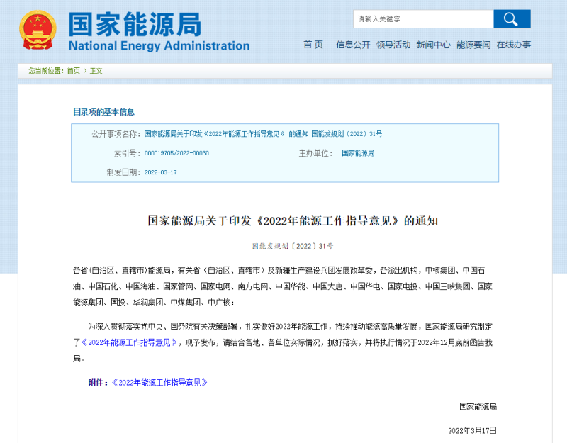 國(guó)家能源局關(guān)于印發(fā)《2022年能源工作指導(dǎo)意見(jiàn)》的通知