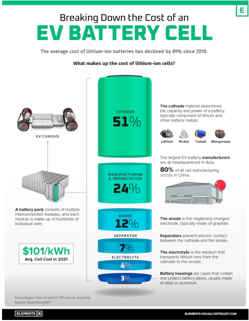 根據(jù)彭博新能源(BloombergNEF)的數(shù)據(jù),Visual Capitalist制作了這張信息圖,詳細(xì)分析了電動(dòng)汽車電池成本: