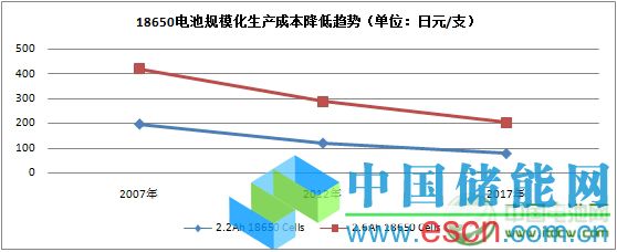 規(guī)?;a(chǎn)電池價格降低趨勢(以18650電池為例)