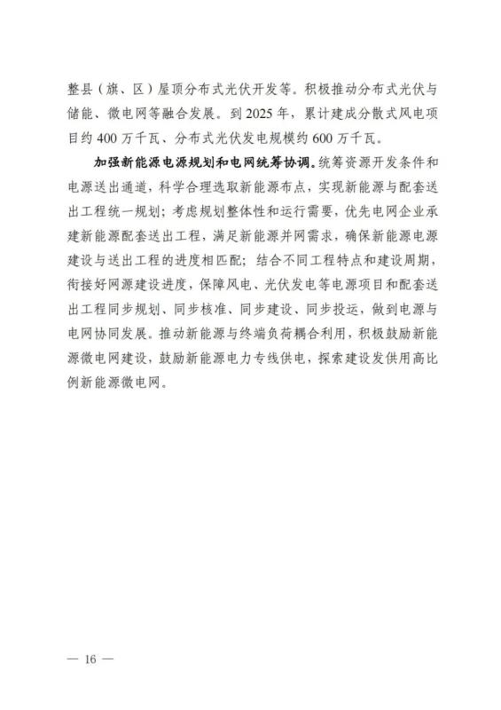 《通知》還指出,加快新能源分布式開發(fā)利用。優(yōu)先在風(fēng)能資源優(yōu)越、土地資源緊缺、靠近負(fù)荷中心地區(qū)發(fā)展分散式風(fēng)電。實(shí)施“千鄉(xiāng)萬村馭風(fēng)行動”推進(jìn)農(nóng)村牧區(qū)分散式風(fēng)電開發(fā)。推動光伏發(fā)電與建筑、農(nóng)業(yè)、交通、通信等領(lǐng)域融合發(fā)展,開展“千家萬戶沐光計(jì)劃”、光伏建筑一體化、風(fēng)光農(nóng)牧互補(bǔ)綜合能源建設(shè)、綠色交通建設(shè)、整縣(旗、區(qū))屋頂分布式光伏開發(fā)等。積極推動分布式光伏與儲能、微電網(wǎng)等融合發(fā)展。到2025年,累計(jì)建成分散式風(fēng)電項(xiàng)目約400萬千瓦、分布式光伏發(fā)電規(guī)模約600萬千瓦。