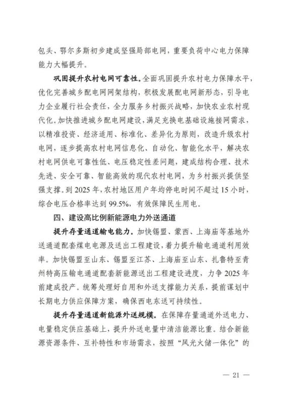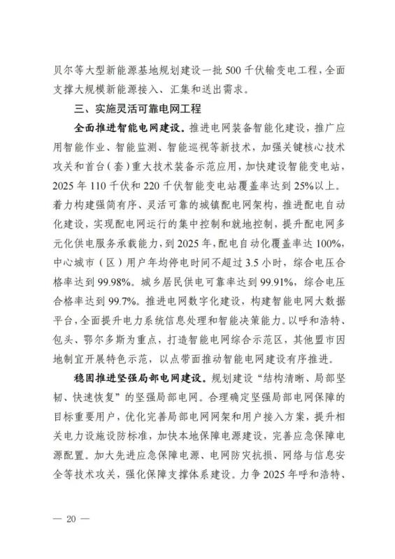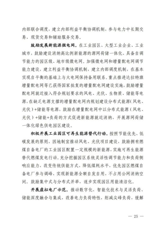 鼓勵(lì)發(fā)展新能源微電網(wǎng)。重點(diǎn)推進(jìn)達(dá)拉特旗增量配電網(wǎng)等已獲得國家批復(fù)的增量配電網(wǎng)建設(shè)實(shí)施,鼓勵(lì)增量配電網(wǎng)就近接入符合規(guī)劃要求的風(fēng)電、光伏、生物質(zhì)、儲能等電源,在缺乏電源支撐的增量配電網(wǎng)內(nèi)規(guī)劃建設(shè)分布式能源(風(fēng)電、光伏)+儲能等電源,鼓勵(lì)在增量配電網(wǎng)中以分布式能源(風(fēng)電、光伏) +儲能+負(fù)荷的方式促進(jìn)新能源就近消納,開展源網(wǎng)荷儲-體化綠色供電園區(qū)建設(shè)。