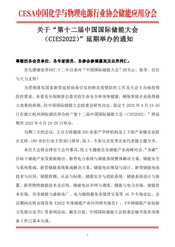 為貫徹落實國家新型冠狀病毒引發(fā)的肺炎疫情防控工作及大會主辦地疫情防控要求,本著充分保障參會嘉賓的生命安全和身體健康,確保參展企業(yè)獲得最大效果的原則,經中國國際儲能大會組委會研究決定,原定于2022年4月24-26日在浙江杭州洲際酒店舉辦的“第十二屆中國國際儲能大會(CIES2022)”將延期至2022年6月24-26日舉辦。