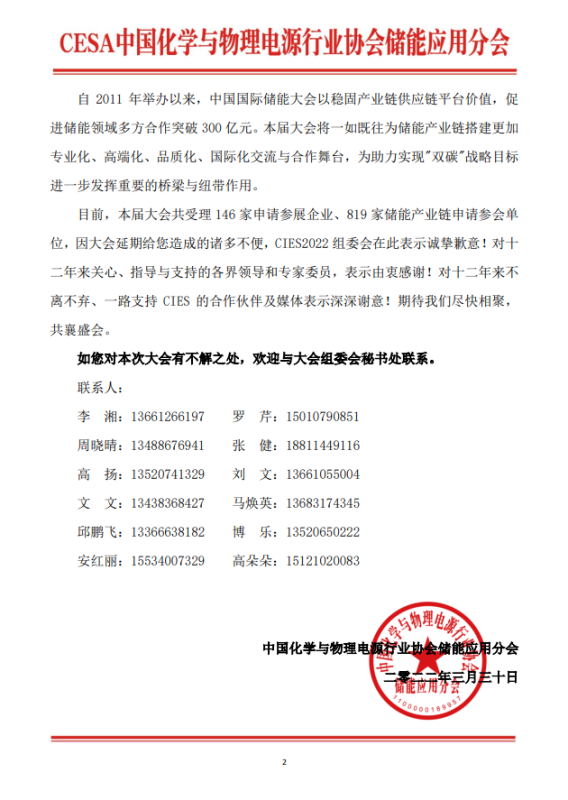 目前,本屆大會共受理146家申請參展企業(yè)、819家儲能產業(yè)鏈申請參會單位,因大會延期給您造成的諸多不便,CIES2022組委會在此表示誠摯歉意!對十二年來關心、指導與支持的各界領導和專家委員,表示由衷感謝!對十二年來不離不棄、一路支持CIES的合作伙伴及媒體表示深深謝意!期待我們盡快相聚,共襄盛會。