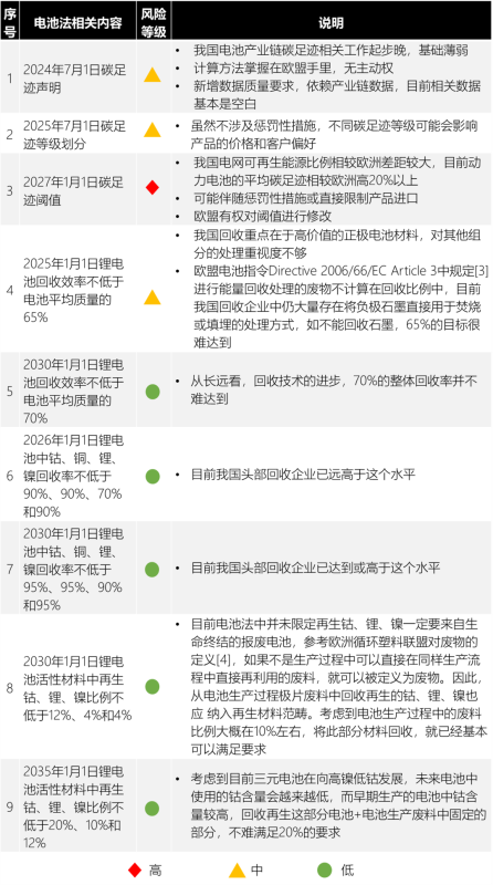 博萃循環(huán)團(tuán)隊(duì)結(jié)合國(guó)內(nèi)產(chǎn)業(yè)鏈目前現(xiàn)狀,針對(duì)歐盟電池法中碳足跡,回收指標(biāo)要求列出如下風(fēng)險(xiǎn)矩陣[3][4]: