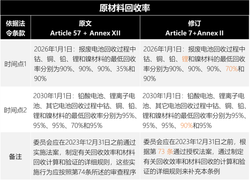 在電池回收效率和材料回收率措施方面,修訂條款將技術(shù)文件中披露回收鈷、鉛、鋰、鎳含量的時(shí)間要求提前至2025年7月1日。同時(shí)對(duì)電池的回收效率以及電池金屬材料回收率做出了更嚴(yán)格的要求,具體如下表所示。