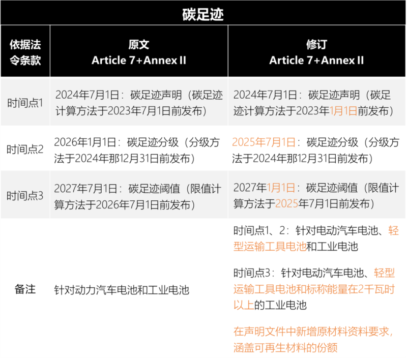 備受關(guān)注的碳足跡相關(guān)內(nèi)容變更集中在執(zhí)行時(shí)間方面,如下表所示,碳足跡建立性能分級(jí)時(shí)間由2026年1月1日提前至2025年7月1日。結(jié)合電池技術(shù)的發(fā)展,歐盟將限制碳足跡的上限,實(shí)施時(shí)間由2027年7月1日提前至2027年1月1日。同時(shí)新增條款賦予歐盟委員會(huì)按照市場(chǎng)情況修改碳足跡上限值的權(quán)利。修訂條款中要求聲明文件中新增原材料信息,涵蓋可再生材料的份額,并且在ANNEX II Carbon footprint部分增加了對(duì)數(shù)據(jù)質(zhì)量的要求。