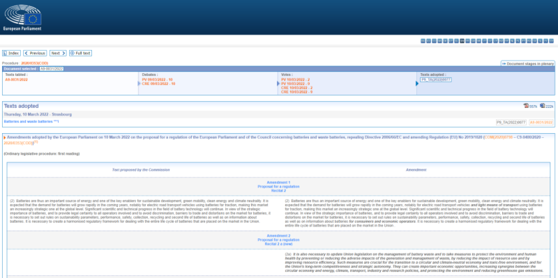 2022年2月10日,歐洲議會(huì)環(huán)境、公共衛(wèi)生和食品安全委員會(huì)以74票贊成、8票反對(duì)、5票棄權(quán)的結(jié)果,投票通過(guò)《歐盟電池與廢電池法規(guī)》擬議規(guī)則,在可持續(xù)性與回收利用要求上提出了更高的要求和目標(biāo)。
