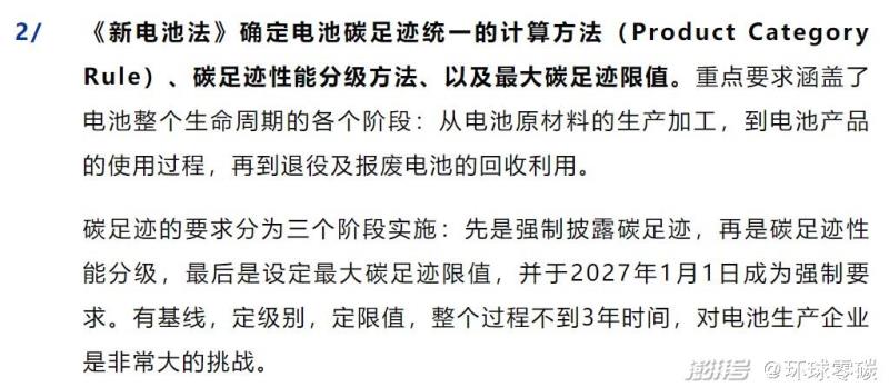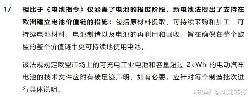 歐盟《新電池法》的要求遠多于原《電池指令》,尤其是增加了對電池碳足跡等要求。正如海華永泰律所律師吳必軒所言:未來將強制電動汽車電池和2kWh以上的工業(yè)電池申報產品碳足跡,并設定碳足跡準入門檻。還有很多其他要求,例如供應鏈盡職調查、歐盟生態(tài)標簽、“電池護照”等。