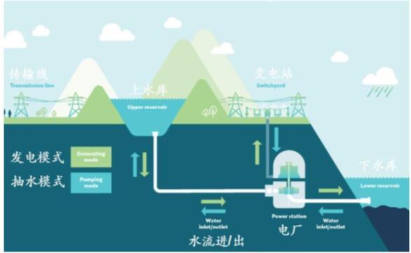 抽水蓄能是利用山上山下兩個(gè)水庫(kù)的高度差,在用電低谷時(shí),用富余的電把山下的水抽到山上儲(chǔ)存起來(lái),在用電高峰時(shí),放水發(fā)電,被譽(yù)為電網(wǎng)安全的穩(wěn)定器、電力調(diào)度的調(diào)節(jié)器和新能源電力的存儲(chǔ)器。