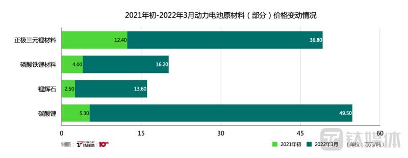 在剛剛過去的一季度中,新能源車企紛紛漲價令消費者叫苦不迭。在終端車型產(chǎn)品普漲3000元至30000元的背后,是電池原材料價格過去一年間的飛漲。根據(jù)中國汽車動力電池產(chǎn)業(yè)創(chuàng)新聯(lián)盟的數(shù)據(jù),從2021年初到2022年三月,正極三元鋰材料均價從12.4萬元/噸上漲至36.8萬元/噸,漲幅高達196.8%;漲幅更為離譜的磷酸鐵鋰材料均價由4萬元/噸飆升至16.2萬元/噸,漲幅為305%。在整個產(chǎn)業(yè)鏈中,上游原材料的漲價更令人瞠目,鋰輝石漲幅達到了444%,均價從2.5萬元/噸漲至13.6萬元/噸,這直接導致電池級別的碳酸鋰均價從5.3萬元/噸上漲至49.5萬元/噸,833.9%的漲幅令一眾車企被迫漲價。