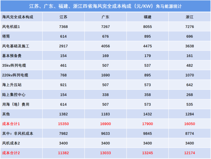 分地區(qū)計算的話,江蘇、廣東、福建、浙江海上風電千瓦投資均價在1.54萬元、1.60萬元、1.79萬元、1.61萬元,除廣東(43%)外,其他各省的風機成本占比均為45%。在假設風機價格降至3400元/kW目非機組成本不變的情況下,四省海風完全成本可以降低至1.14萬元/KW、1.30萬元/KW 、1.32萬元/KW、 1.21萬元/kW。