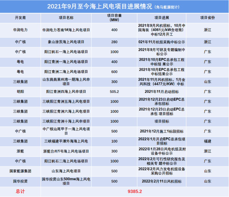 在停滯了9個月后,2021年9月海上風電招標重啟。根據(jù)「角馬能源」不完全統(tǒng)計,去年9月至今,中國有招標動態(tài)的項目有9.38GW。