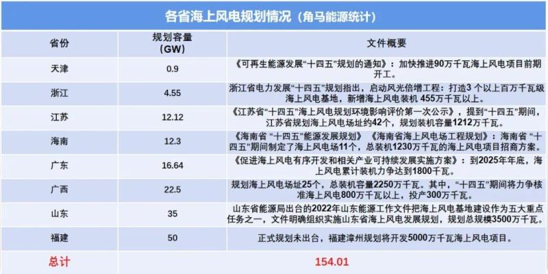 根據(jù)「角馬能源」不完全統(tǒng)計,“十四五”期間,福建、廣東、江蘇、浙江、廣西、天津等8個省份的海上風電累計規(guī)劃容量達到154.01GW。為我國“十三五”海上風電增量8.25GW的18.67倍。這意味著,“十四五”末期,海上風電將可能迎來倍速增長。