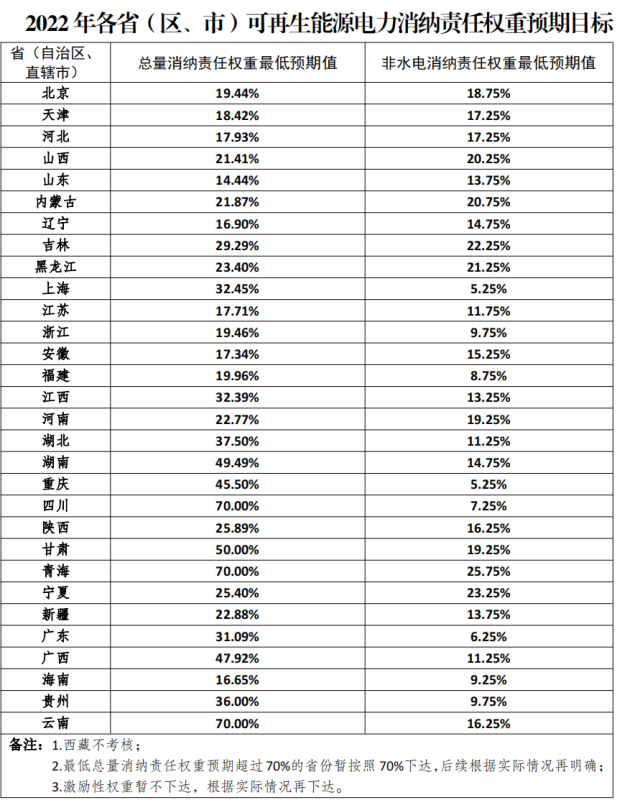 為落實碳達峰、碳中和任務,實現(xiàn)2025年非化石能源占一次能源消費比重提高至20%左右的目標,去年5月,國家發(fā)展改革委、國家能源局印發(fā)2021年可再生能源電力消納責任權(quán)重和2022年預期目標。這是各省都將要完成的約束性指標。