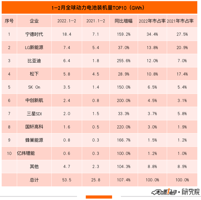 1-2月,全球新能源汽車(chē)裝機(jī)量53.5GWh,同比增長(zhǎng)超1倍。寧德時(shí)代、LG新能源、比亞迪分列前三。松下被比亞迪反超,排名下降至第四,SK On穩(wěn)居第五;中創(chuàng)新航超越三星SDI躋身第六,繼去年11月上榜后,億緯鋰能再次上榜躋身1-2月總榜第10。