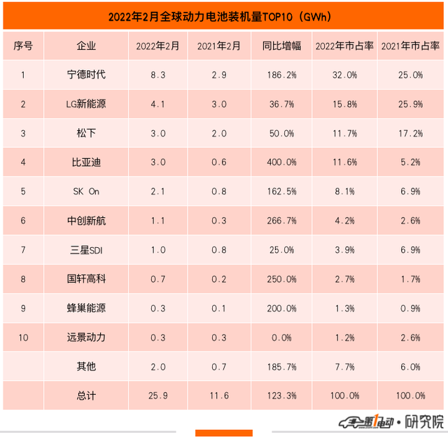 根據(jù)韓國(guó)市場(chǎng)研究機(jī)構(gòu)SNE Research數(shù)據(jù)顯示,2022年2月,全球動(dòng)力電池裝機(jī)量為25.9GWh,同比增長(zhǎng)123.3%。寧德時(shí)代穩(wěn)居冠軍寶座,LG新能源獲得亞軍,松下以微小的差距再次領(lǐng)先比亞迪,奪得季軍。