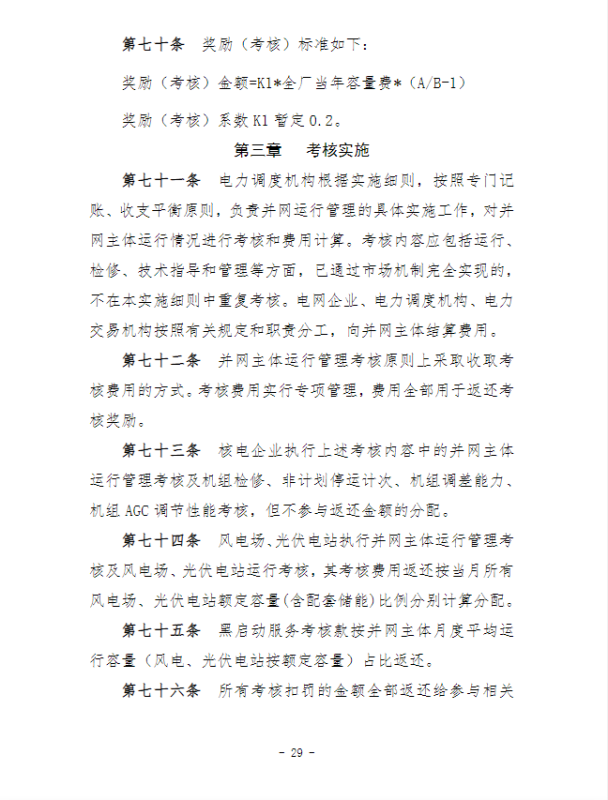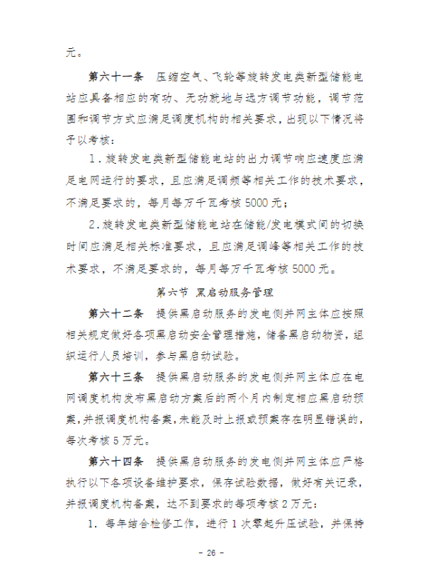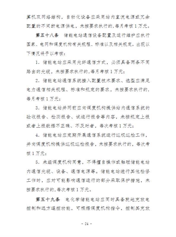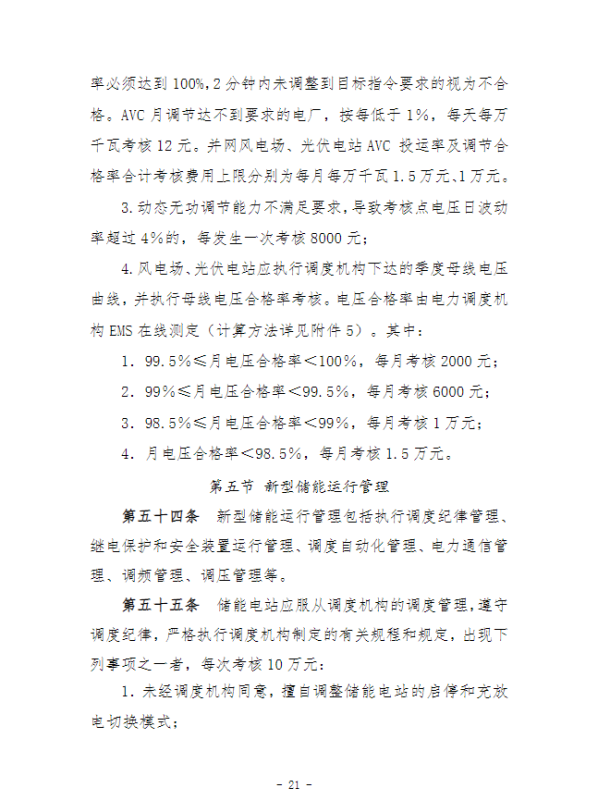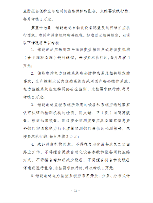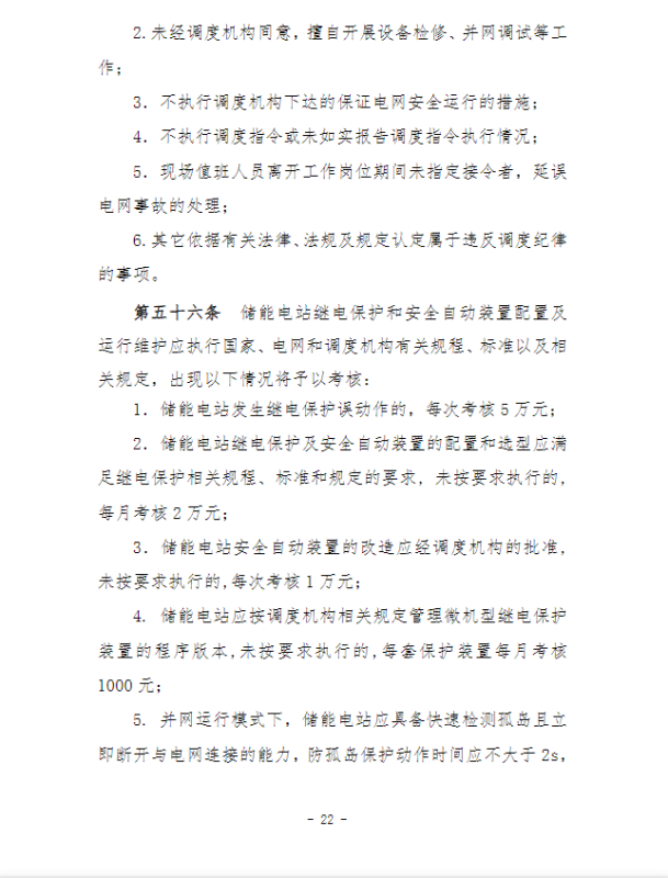 在并網(wǎng)運(yùn)行管理細(xì)則中,“新型儲(chǔ)能運(yùn)行管理”、“抽水蓄能電站可用率管理”章節(jié),明確要求儲(chǔ)能電站應(yīng)服從調(diào)度機(jī)構(gòu)的調(diào)度管理,出現(xiàn)各類違規(guī)情況將需要支付考核費(fèi)用:如出現(xiàn)擅自調(diào)整儲(chǔ)能電站的啟停和充放電切換模式、擅自開(kāi)展設(shè)備檢修并網(wǎng)調(diào)試工作、或值班人員離守延誤電網(wǎng)事故處理等情況,每次考核10萬(wàn)元;儲(chǔ)能電站發(fā)生繼電保護(hù)誤動(dòng)作的,每次考核5萬(wàn)元;儲(chǔ)能電站繼電保護(hù)及安全自動(dòng)裝置的配置和選型未按要求執(zhí)行的,每月考核2萬(wàn)元。