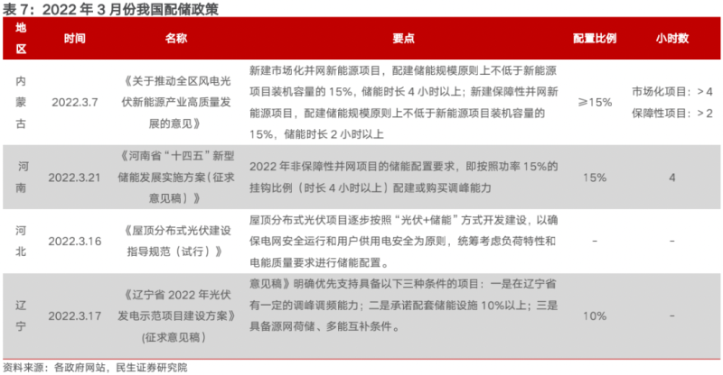 3月份強制配儲政策中配儲時長有所增加,大多要求4小時以上。3月7日內(nèi)蒙古發(fā)布《關(guān)于推動全區(qū)風電光伏新能源產(chǎn)業(yè)高質(zhì)量發(fā)展的意見》,要求配儲比例不低于15%,市場化項目配儲市場大于4小時,3月21日,河南發(fā)布《河南省“十四五”新型儲能發(fā)展實施方案(征求意見稿)》要求非保障性項目配儲時長為4小時以上,《“十四五”新型儲能發(fā)展實施方案》提到“推動長時間電儲能、氫儲能、熱(冷)儲能等新型儲能項目建設(shè)”,長時配儲有利于降低單瓦時成本,同時是可再生能源高比例大規(guī)模并網(wǎng)下的剛需新基建。