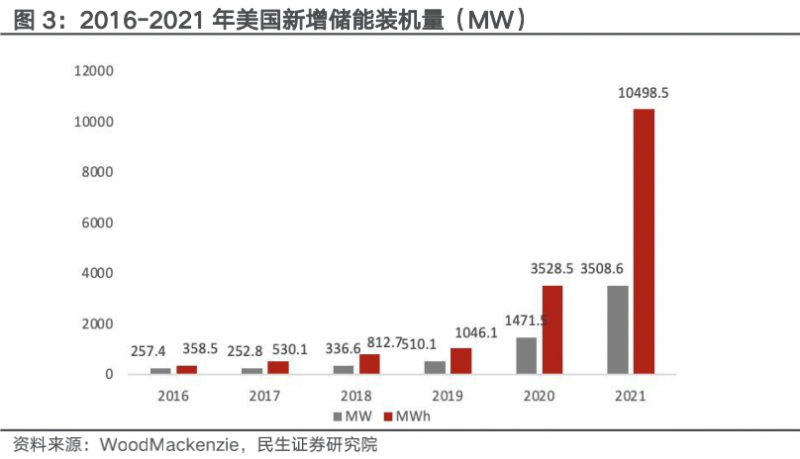 美國市場2022年Q1電網(wǎng)側(cè)裝機達到1.7GW。根據(jù)WoodMackenzie數(shù)據(jù),美國儲能市場2021四季度創(chuàng)下新紀錄,新增裝機規(guī)模達4.7GWh,電網(wǎng)側(cè)去年新增裝機規(guī)模達到了3GW/9.2GWh,增長近2倍,此前由于供應鏈問題帶來的700MW產(chǎn)能預計將推遲到2022年一季度開工,推動2022年一季度電網(wǎng)側(cè)裝機達到1.7GW,得益于加州以外市場太陽能+儲能的銷售,用電側(cè),戶用端年總裝機量為436MW,2022年一季度裝機達到123MW;工商業(yè)去年四季度裝機規(guī)模為58MWH,全年裝機規(guī)模為162MW/350MWH。