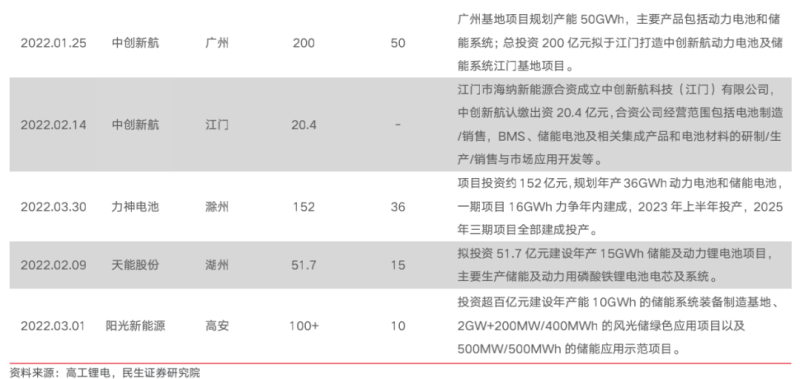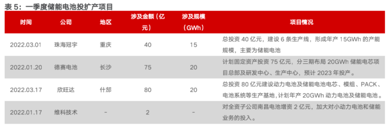 儲能電池方面,據(jù)不完全統(tǒng)計,2022年一季度,國內(nèi)投擴產(chǎn)項目10個,涉及金額超720億元,規(guī)模超166GWh。具體來看,參與主體上,既有包括珠海冠宇、德賽電池等3C數(shù)碼電池企業(yè),又有中創(chuàng)新航、力神電池、欣旺達、天能股份等動力電池企業(yè),還有陽光系能源等儲能系統(tǒng)集成商。多元的背景構(gòu)成了該賽道的公司格局,入局者呈多元化趨勢。投建規(guī)模上,均呈大規(guī)模布局之勢。一季度以來,投擴產(chǎn)項目所涉規(guī)模最小也有10GWh。另外,與去年“動力電池+儲能電池”布局模式不同,儲能單獨投擴產(chǎn)項目日益增多。
