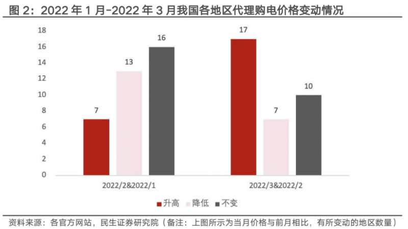 代理購電價格普遍上漲,3月份上漲的省市較2月份增加10個。開年后電網(wǎng)企業(yè)代理購電價格普遍出現(xiàn)上漲,如北京、廣東、上海等等均出現(xiàn)了不同程度的上漲,3月份電價上漲的地區(qū)比2月份多10個,這反映了全國各省市電力供應出現(xiàn)偏緊的態(tài)勢,2022年1月份相較于2021年12月份一般工商業(yè)代理購電峰谷價上漲的地區(qū)為11個超過下降的地區(qū)8個,體現(xiàn)了工商業(yè)峰谷電價差任然是以擴大為主。