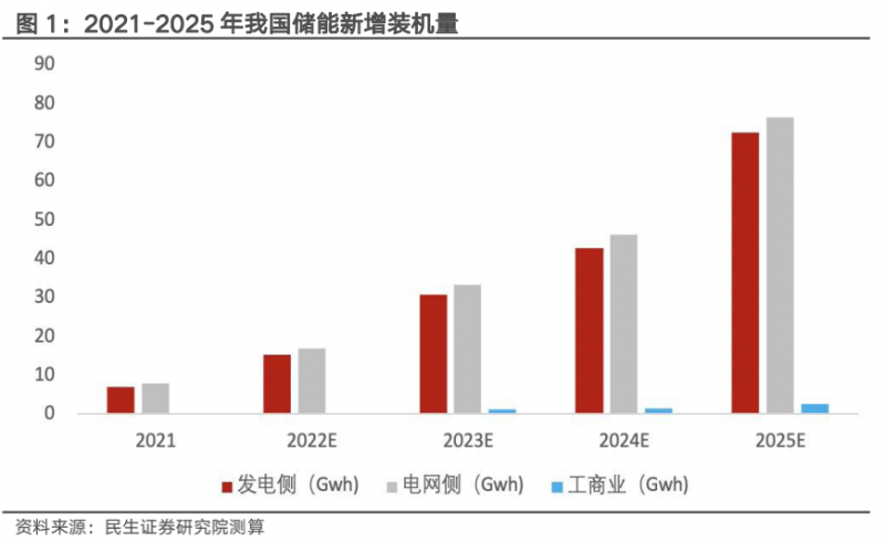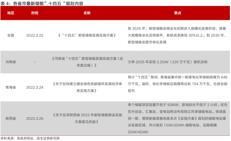 兩部委印發(fā)《“十四五”新型儲能發(fā)展實施方案》,對“十四五”期間儲能發(fā)展進行了頂層設(shè)計。方案要求到2025年,新型儲能由商業(yè)化初期步入規(guī)模化發(fā)展階段,具備大規(guī)模商業(yè)化應用條件,系統(tǒng)成本降低30%以上,到2030年,新型儲能全面市場化發(fā)展?!笆奈濉睍r期是我國實現(xiàn)碳達峰目標的關(guān)鍵期和窗口期,也是新型儲能發(fā)展的重要戰(zhàn)略機遇期。隨著電力系統(tǒng)對調(diào)節(jié)能力需求提升、新能源開發(fā)消納規(guī)模不斷加大,尤其是沙漠戈壁荒漠大型風電光伏基地項目集中建設(shè)的背景下,新型儲能建設(shè)周期短、選址簡單靈活、調(diào)節(jié)能力強,與新能源開發(fā)消納的匹配性更好,優(yōu)勢逐漸凸顯,加快推進先進儲能技術(shù)規(guī)?;瘧脛菰诒匦小8魇∈幸布娂姲l(fā)布了本省的“十四五”期間儲能發(fā)展政策,其中河南省力爭2025年實現(xiàn)2.2GW裝機目標,陜西省遠期規(guī)劃2GW/4GWh儲能電站,而青海省預計“十四五”期間電化學儲能總規(guī)模將達到70.4GW,位居全國前列。