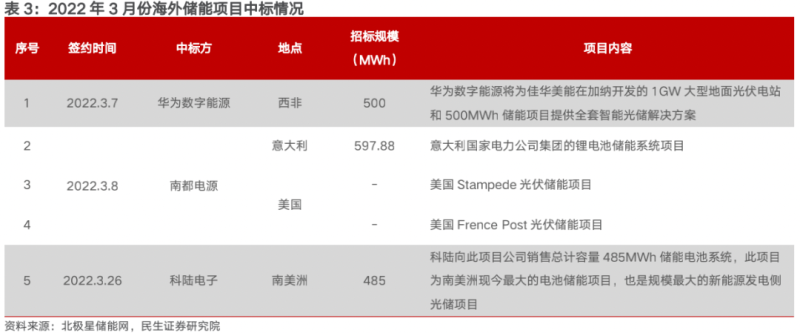 國內(nèi)企業(yè)紛紛出海,中標海外儲能項目,不斷進行全球化布局。據(jù)不完全統(tǒng)計,3月份國內(nèi)企業(yè)中標海外儲能項目達1.58GWh,不斷推進出海戰(zhàn)略,其中華為數(shù)字能源將為佳華美能在加納開發(fā)的1GW大型地面光伏電站和500MWh儲能項目提供全套智能光儲解決方案,滿足加納政府制定的于2030年可再生能源比例在能源結(jié)構(gòu)中占比提升至10%的要求??脐戨娮訛槟厦雷畲蟮膬δ茈娬咎峁╇姵貎δ芟到y(tǒng),3月8日南都電源中標意大利國家電力公司儲能項目,同時簽約了2個美國光伏儲能項目,國內(nèi)企業(yè)紛紛出海搶占國外市場。