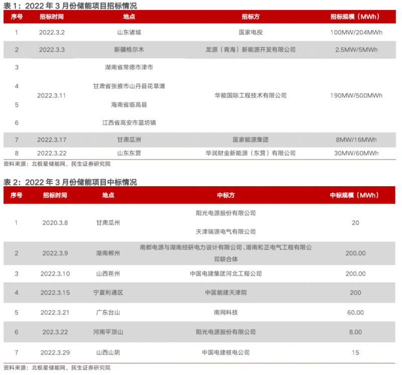 3月份招投標工作穩(wěn)步推進,為今年儲能新增裝機維持高增奠定基礎(chǔ)。據(jù)不完全統(tǒng)計,國內(nèi)3月份招標的電化學儲能電站裝機規(guī)模為785MWh,中標企業(yè)規(guī)模合計約為523MWh。根據(jù)GGII數(shù)據(jù),3月份新能源裝機規(guī)劃規(guī)模最大的內(nèi)蒙古在建儲能電站裝機容量為2.2GWh,山東在建儲能電站容量為2.0GWh,兩地3月份在建儲能電站裝機容量之和為4.2GWh約占2022年全年預計新增裝機13.05GWh的32%,2022年全年新增裝機規(guī)模高增有望實現(xiàn)。