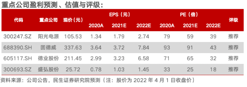 重點推薦含儲量高的逆變器公司【陽光電源】、【德業(yè)股份】、【固德威】、【盛弘股份】;關(guān)注儲能消防領(lǐng)域龍頭【青鳥消防】,以及儲能溫控有望快速放量【英維克】。