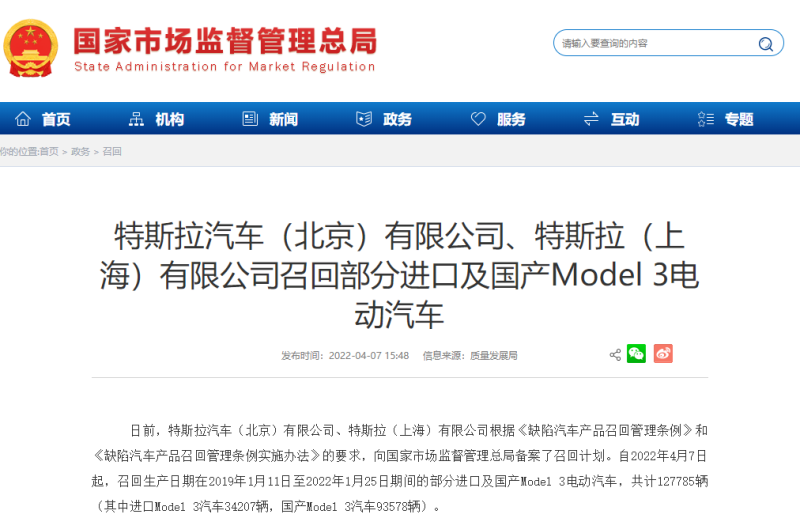 中國儲(chǔ)能網(wǎng)訊:4月7日,國家市場監(jiān)管總局發(fā)布公告稱,特斯拉汽車(北京)有限公司、特斯拉(上海)有限公司自2022年4月7日起,召回生產(chǎn)日期在2019年1月11日至2022年1月25日期間的部分進(jìn)口及國產(chǎn)Model 3電動(dòng)汽車,共計(jì)127785輛(其中進(jìn)口Model 3汽車34207輛,國產(chǎn)Model 3汽車93578輛)。