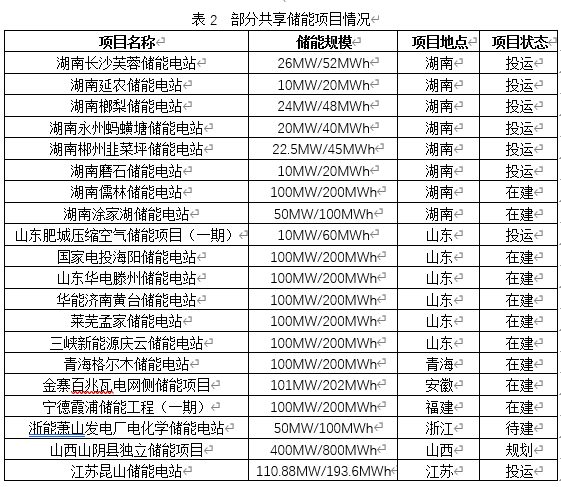 除湖南、山東外,青海、山西、安徽等地也有共享儲能電站處于建設(shè)或開發(fā)階段。據(jù)不完全統(tǒng)計,全國各地已公布的共享儲能電站項目總裝機規(guī)模已接近10GW/20GWh(部分共享儲能電站項目如表2所示)。