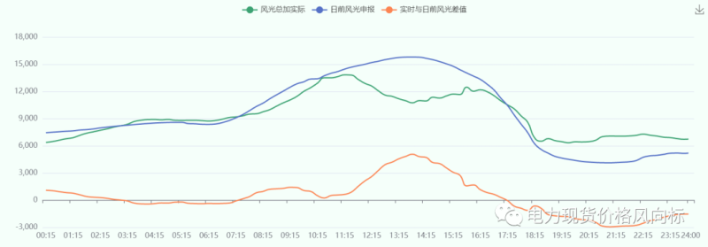新能源發(fā)電中,風電光伏總加日前申報功率全天平均值為9595.01MW,實際發(fā)電功率全天平均為9308.28MW。實時功率和日前申報功率,全天出現(xiàn)的平均偏差率為3.08%。