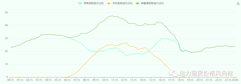 全天,新能源出力峰谷差率為2.46。新能源占統(tǒng)調(diào)發(fā)電比重的具體實時曲線如下圖所示: